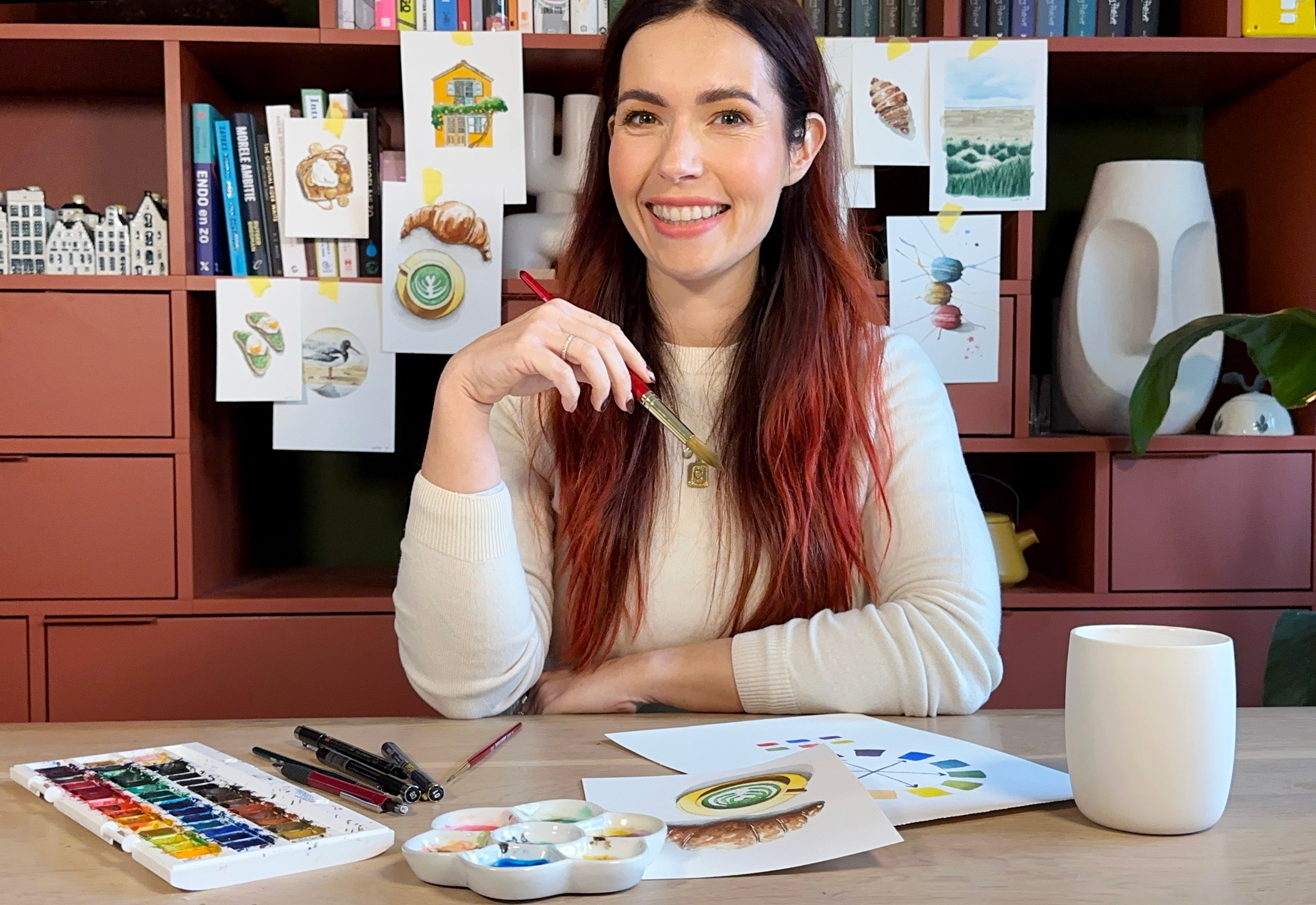 De basisbenodigdheden zijn: waterverf, aquarelpapier, schetspapier, fineliners, een potlood en een gum. Voor elke Paint Along krijg je een materialenlijst zodat je precies weet wat handig is om bij de hand te hebben. Maar gebruik vooral wat je al hebt – je hoeft echt geen complete professionele set aan te schaffen!
